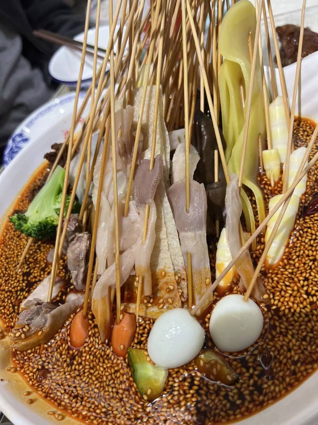 钵钵鸡——抓一把串串浸入红油,芝麻和红油的香气完美融合。