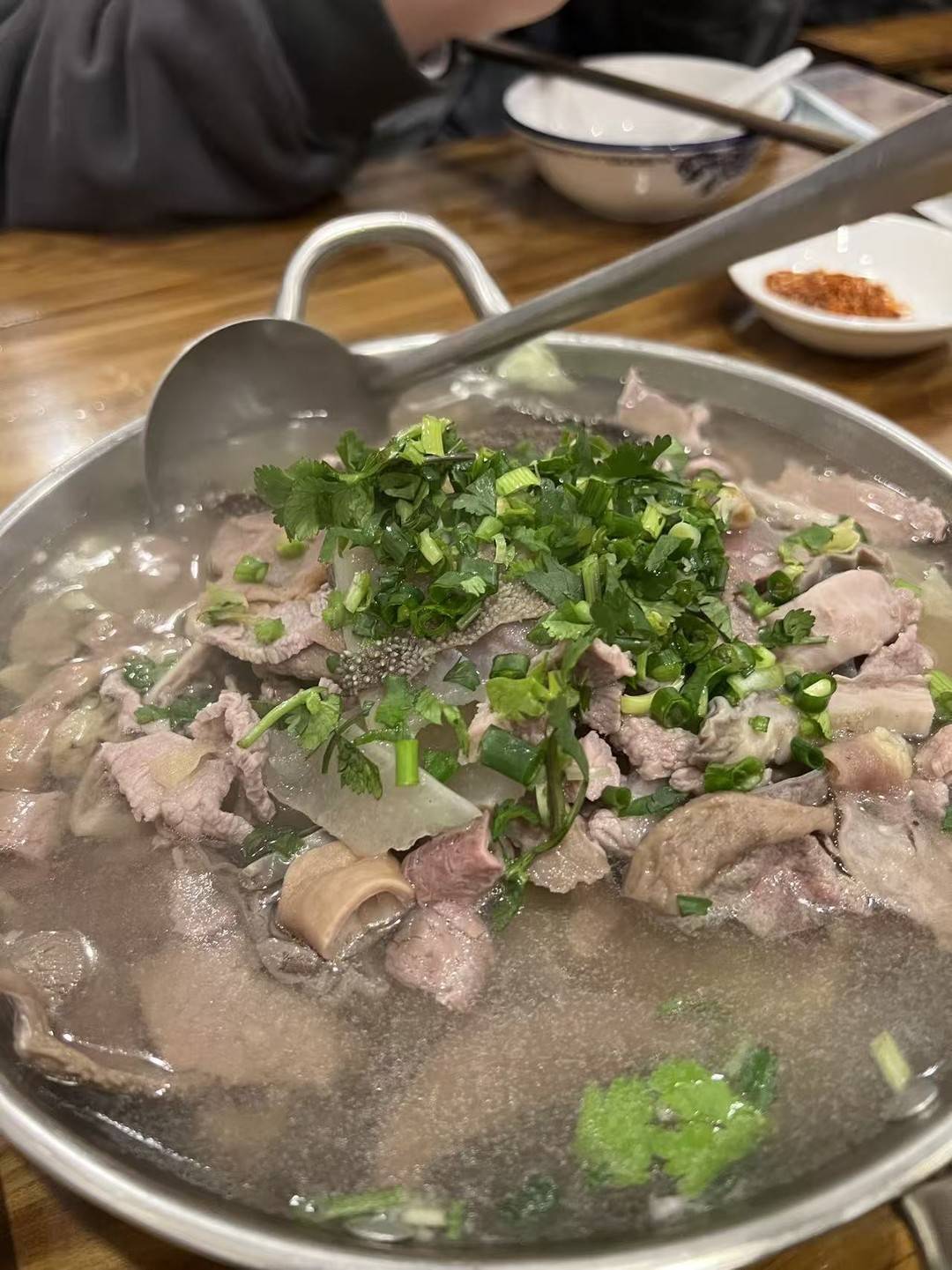中午,必须上硬菜了!跷脚牛肉是重头戏。药膳味浓郁的汤底,牛肉牛杂往滚汤里一烫,在蘸碟里打个滚——麻辣鲜香,一碗下去,身心都熨帖了。