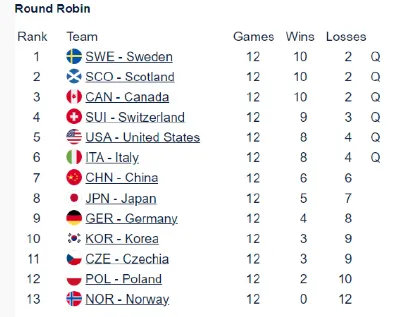 由于循环赛前六名才能晋级淘汰赛,中国队以一个名次之差遗憾无缘附加赛。晋级淘汰赛的六支队伍分别是瑞士、苏格兰、加拿大、瑞典、美国和意大利。